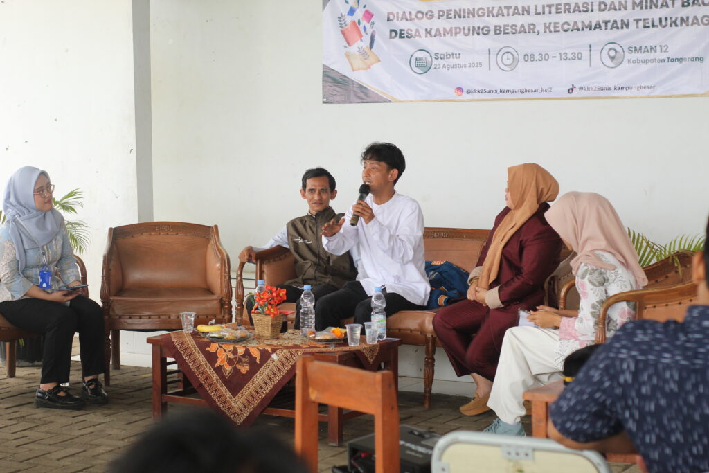 Dialog literasi menghadirkan penerima Kepustakaan Islam Award Aip Rochadi, S.IP, Pendiri Oemah Daon Bunda Mey, dan Relawan Literasi Masyarakat (Relima) Perpusnas RI Andri Gunawan, S.Kom. Kegiatan ini dihadiri oleh perwakilan Kecamatan Teluknaga, Karang Taruna, ibu-ibu PKK, perwakilan RT/RW, Sekretaris Desa Kampung Besar, serta perwakilan SMAN 12 Kabupaten Tangerang.