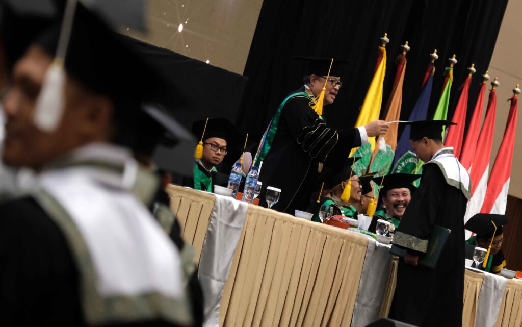 sejati terletak pada bagaimana ilmu itu diamalkan untuk membawa manfaat. Rektor mengingatkan pesan Ibnu Khaldun bahwa manusia adalah makhluk sosial. Keberhasilan seseorang tidak bermakna jika tidak memberi dampak pada masyarakat dan peradaban. “Jadilah generasi yang membawa pengetahuan, iman, dan manfaat bagi bangsa, negara, dan umat manusia,” tutupnya.