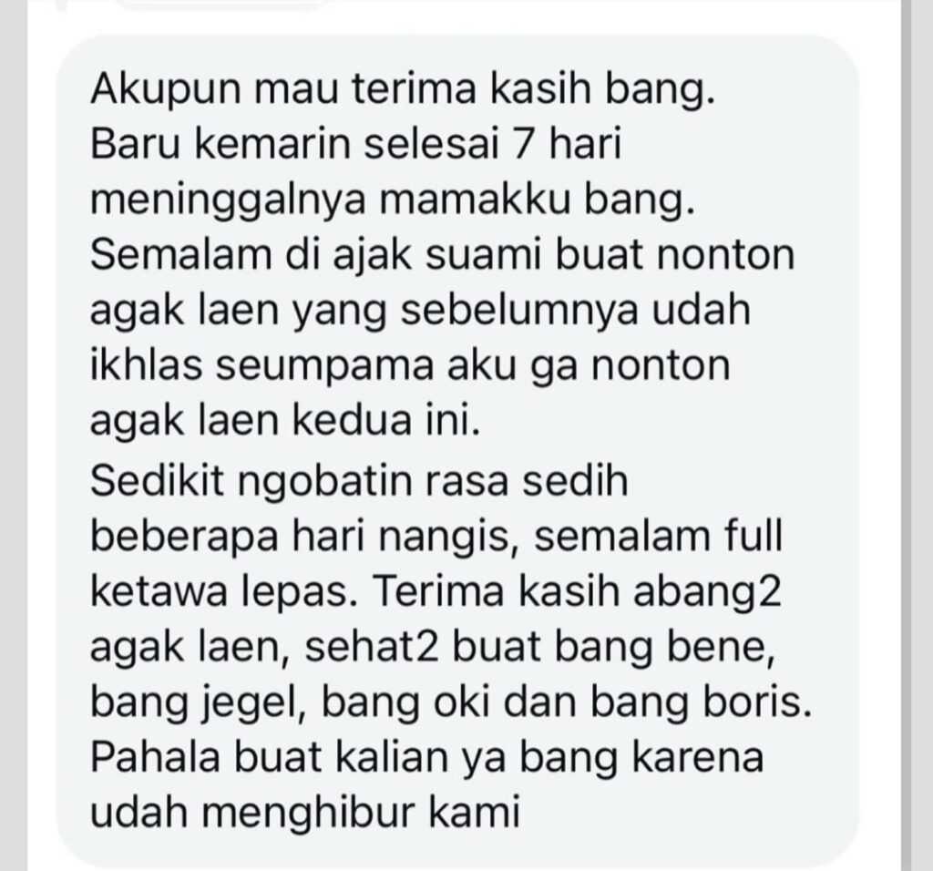 Dampak penyembuhan ini terasa langsung oleh banyak individu di seluruh Indonesia yang menginspirasi tim Agak Laen yang terdiri dari Bene Dion, Boris Bokir, Indra Jegel, dan Oki Rengga. Salah satu penonton berbagi pengalaman bahwa menonton film ini tujuh hari setelah meninggalnya ibu (mamak), tawa yang disuguhkan mampu mengobati rasa sedih yang selama beberapa hari hanya bisa dihabiskan dengan menangis. Cerita lain datang dari seorang perantau yang stres dan homesick akibat pekerjaan, yang merasa bersalah karena baru sempat menonton, namun akhirnya film ini benar-benar menjadi mood booster dan membuatnya kembali merasakan happy.